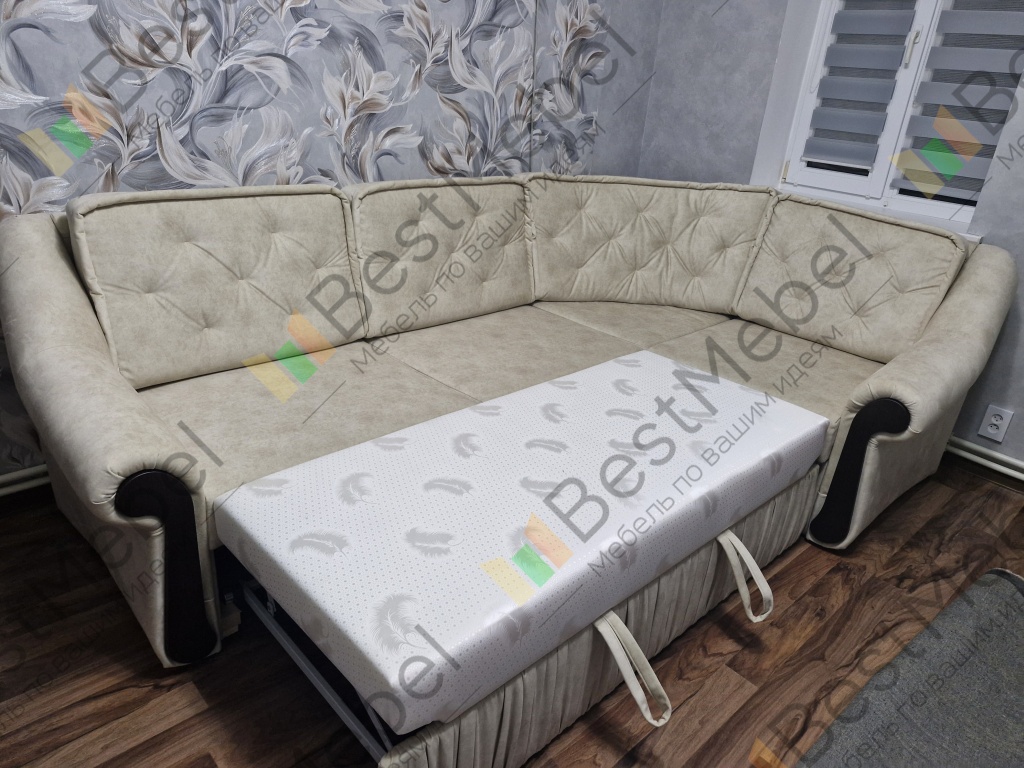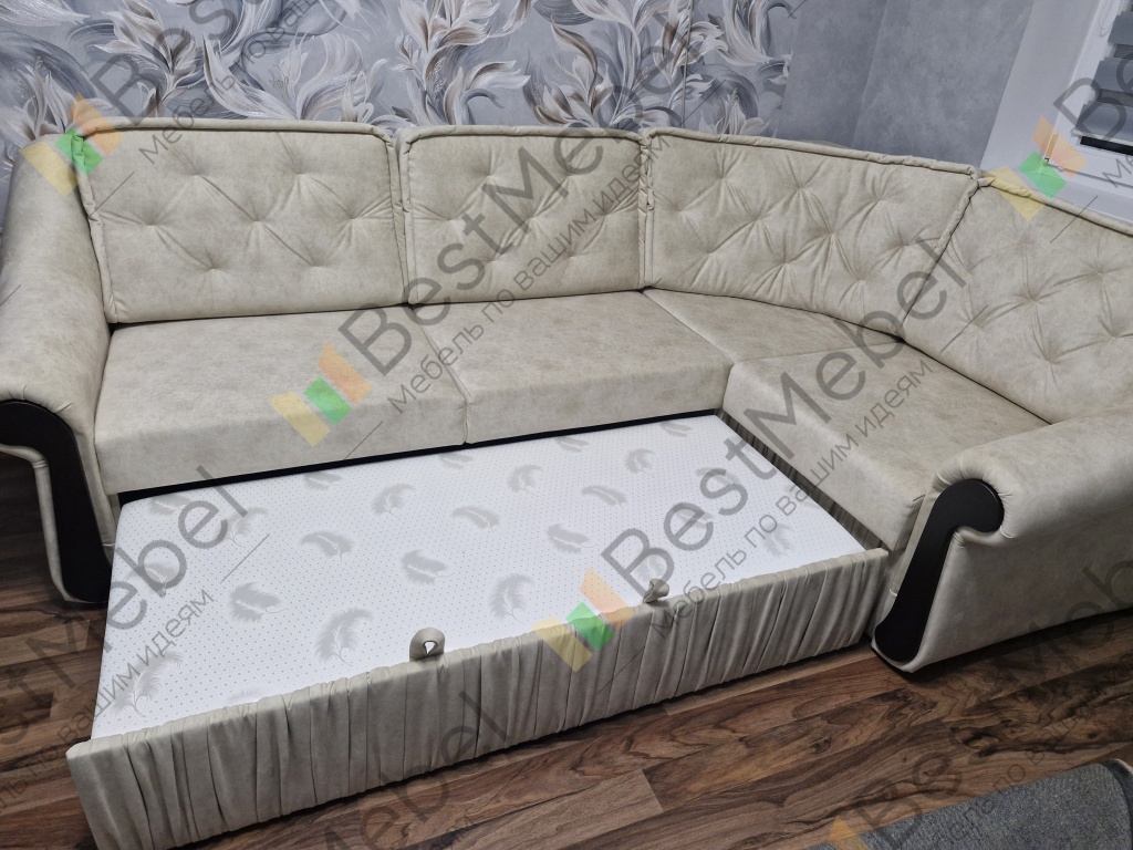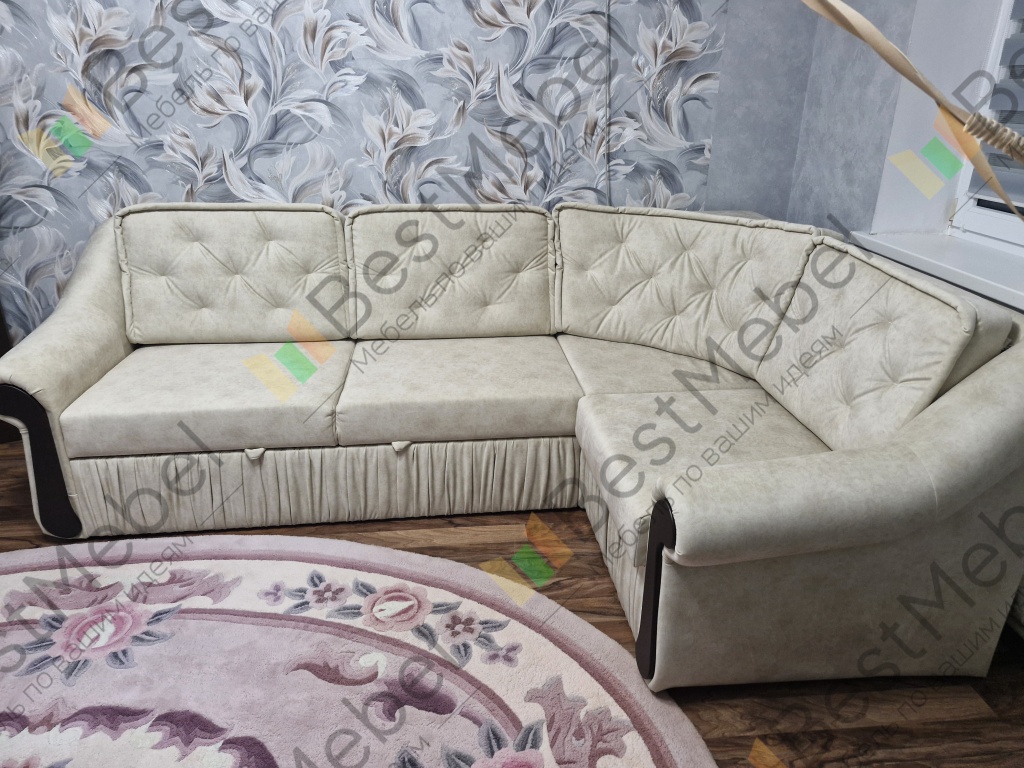 Угловой диван раскладывается под спальное место. Есть ящик для белья. К спинке дивана подушки крепятся на молнии. Спальное место выдвигается при помощи механизма "дельфин". При заказе можно изменить размеры и цвет обивки.