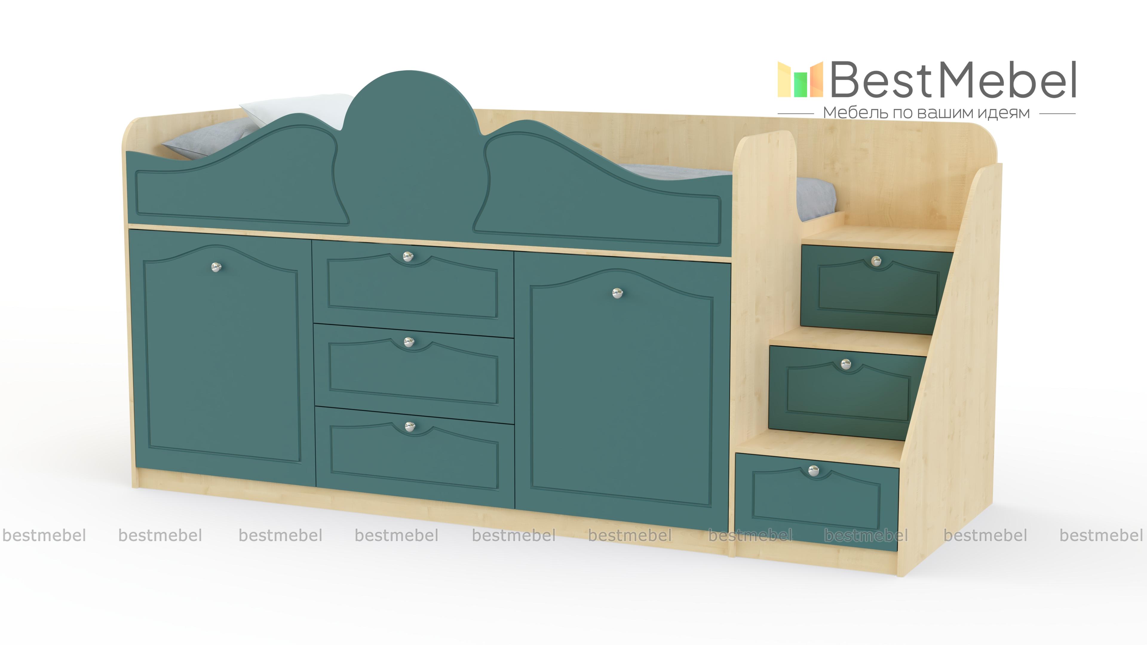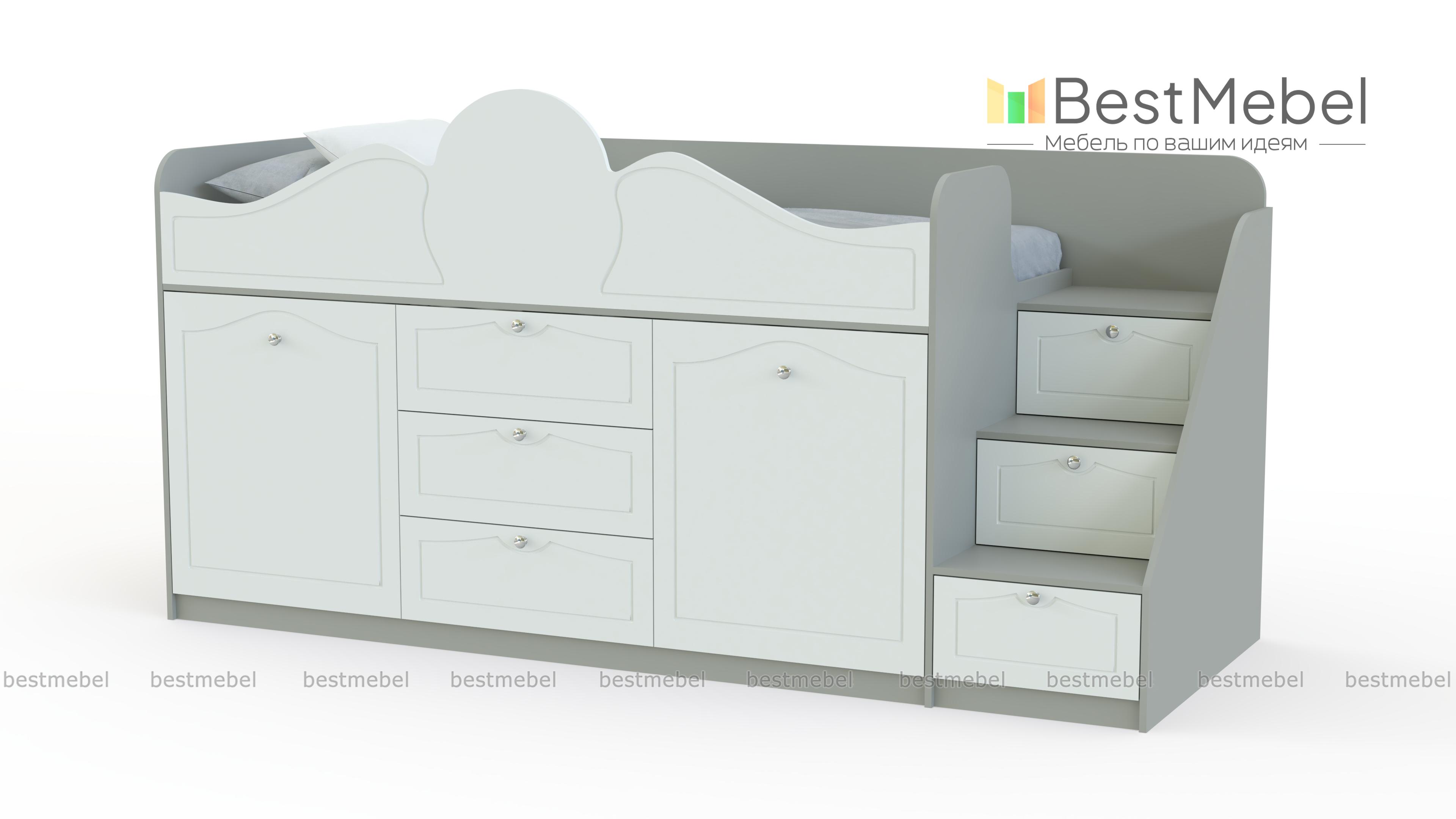 Кровать-чердак Стриж-1 BMS выполнена в классическом стиле и украшена по фасаду фрезеровкой. Элегантная композиция в нежных светлых тонах станет прекрасным выбором для спальни девочки. На втором ярусе располагается уютное спальное место с фигурно вырезанным бортиком, а на первом – лестница-комод, выдвижные ящики и шкафчик для одежды и постельного белья, а также скрытый в нише выкатной столик. Купить кровать-чердак Стриж-1 BMS и эффективно использовать пространство вам поможет наш интернет-магазин.