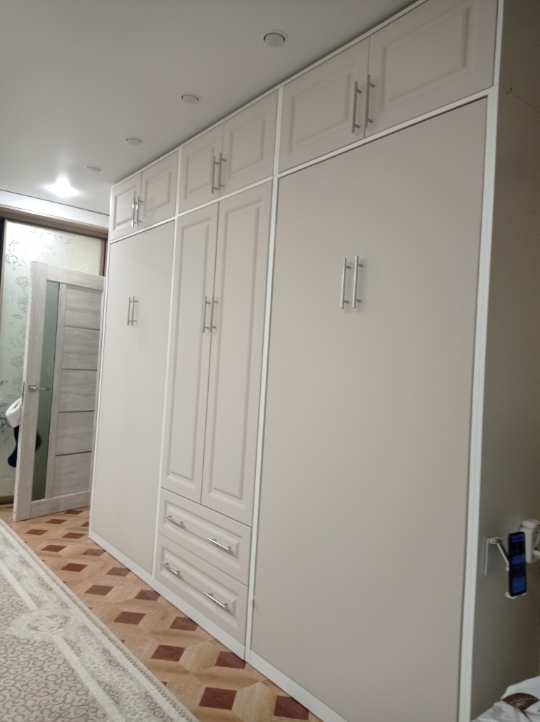 Мы не рекомендуем покупать пружинные матрасы к шкафу-кровати. Стоит отдавать предпочтение беспружинным изделиям. Это связано с тем, что поведение пружин в вертикальном положении матраса невозможно предсказать. Матрас быстро подвергается деформации и смещению слоев. Идеальным вариантом для откидной модели будет лёгкий беспружинный матрас, основу которого составляют современные материалы, не имеющие в составе пружины.