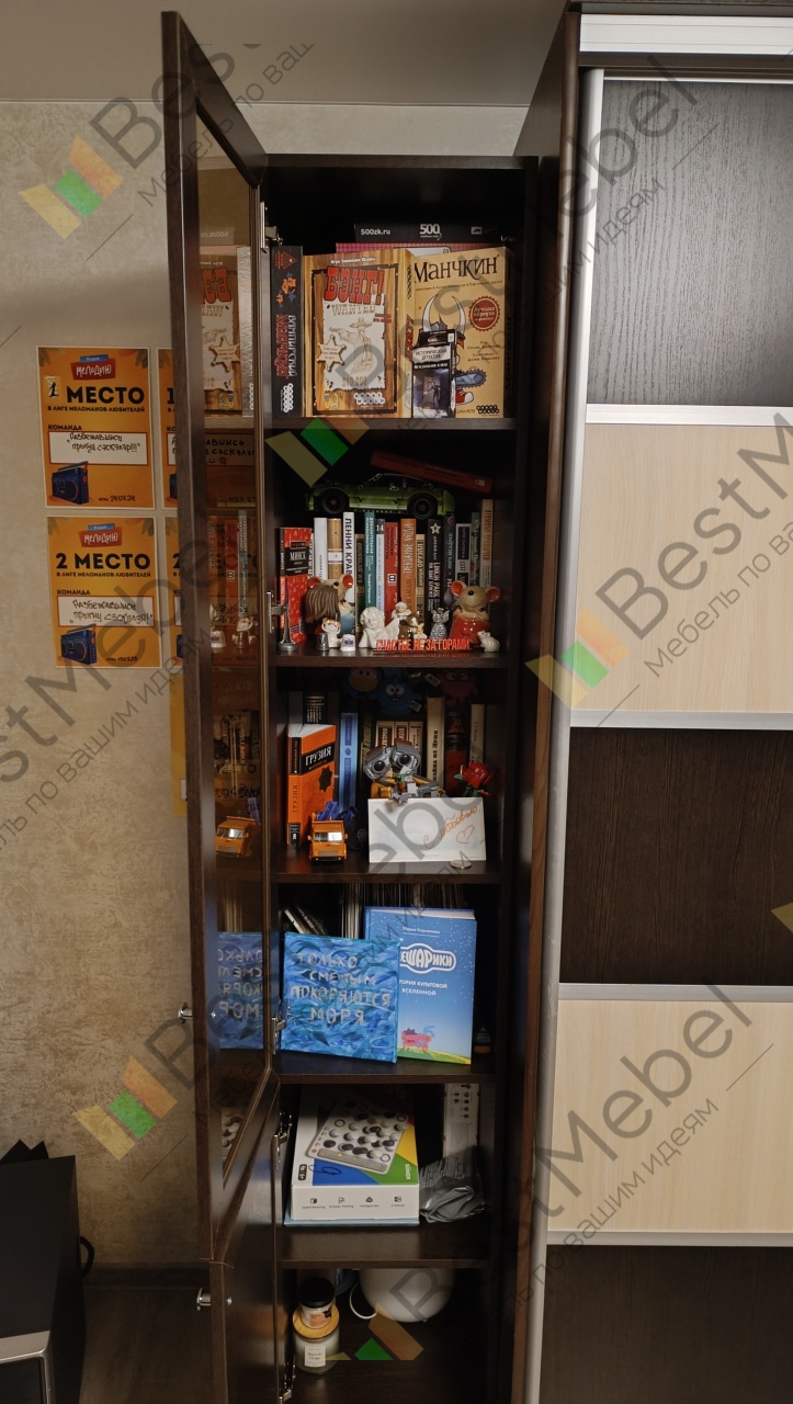 Книжный шкаф купила в дополнение к распашному шкафу. Вписался фантастически! Немного напутала с расцветкой, но даже лучше стало) Всем советую, спасибо магазину Бестмебельшоп за быстрое производство и доставку. Всё детали в комплекте, без нареканий. Супер!