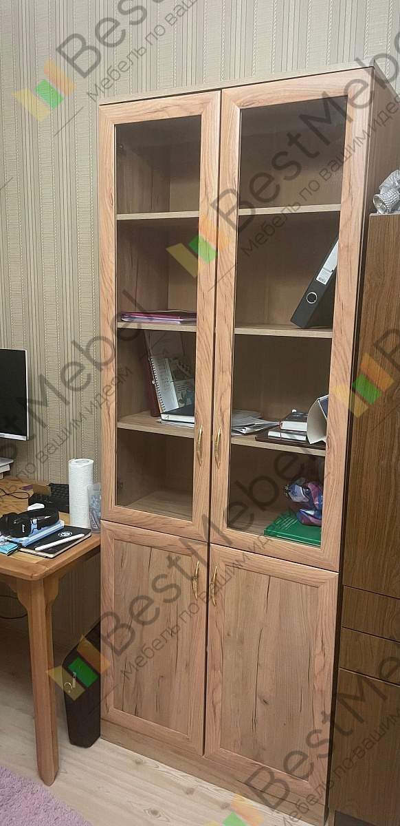 Хороший книжный шкаф. Сделали под мои размеры + выбрал дверцы с доводчиками и подрезку под плинтус, и еще ручки. Лучше собирать в конструкторе, чтобы не упустить детали изделия. Изготовление и доставка до Беларуси +/- 3 недели, собрать шкаф можно самому. Пару дней пах ДСП или краской, или еще чем-то таким, потом проветрился и сейчас все нормально. Заказ:№ 1229910.