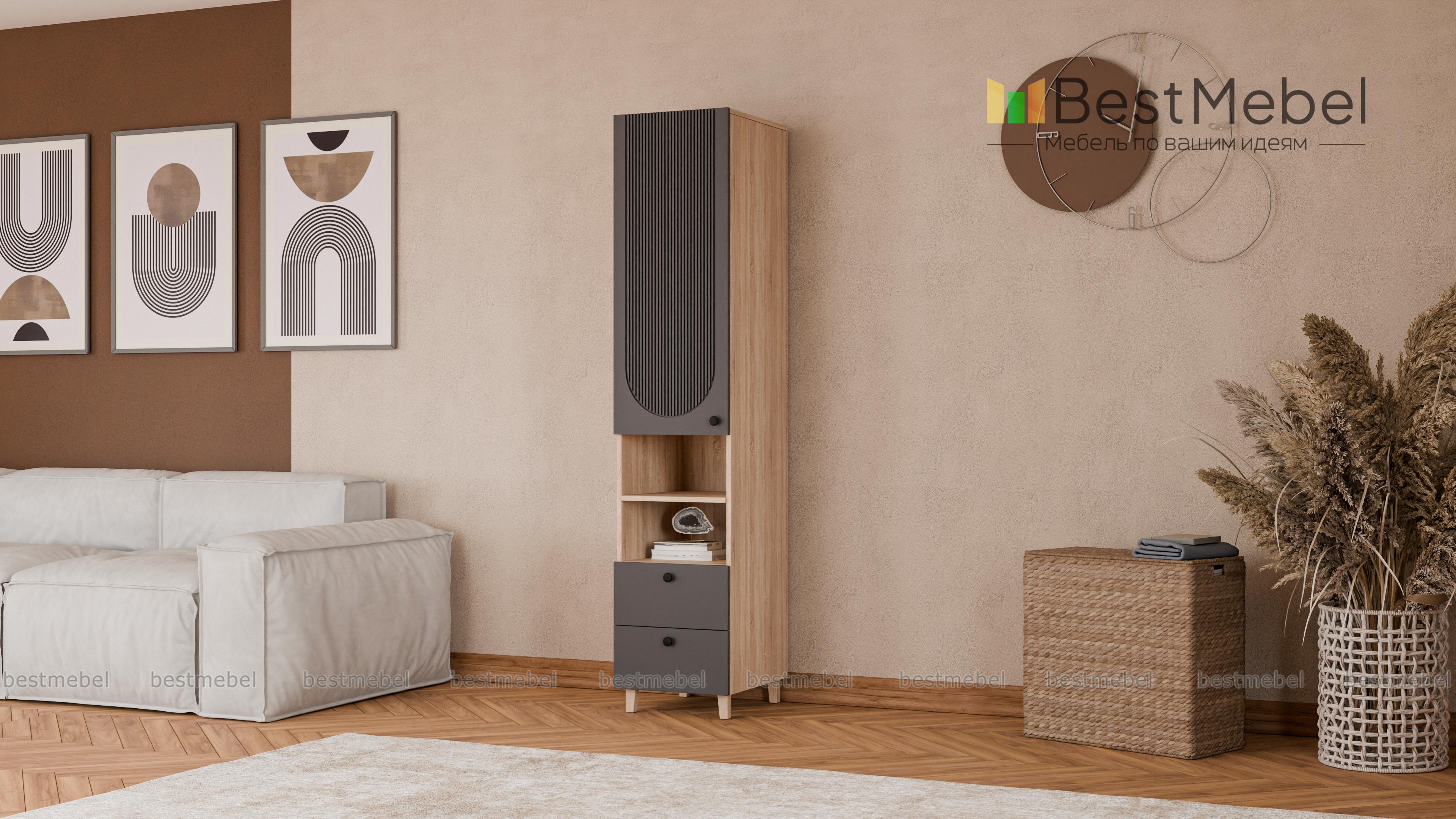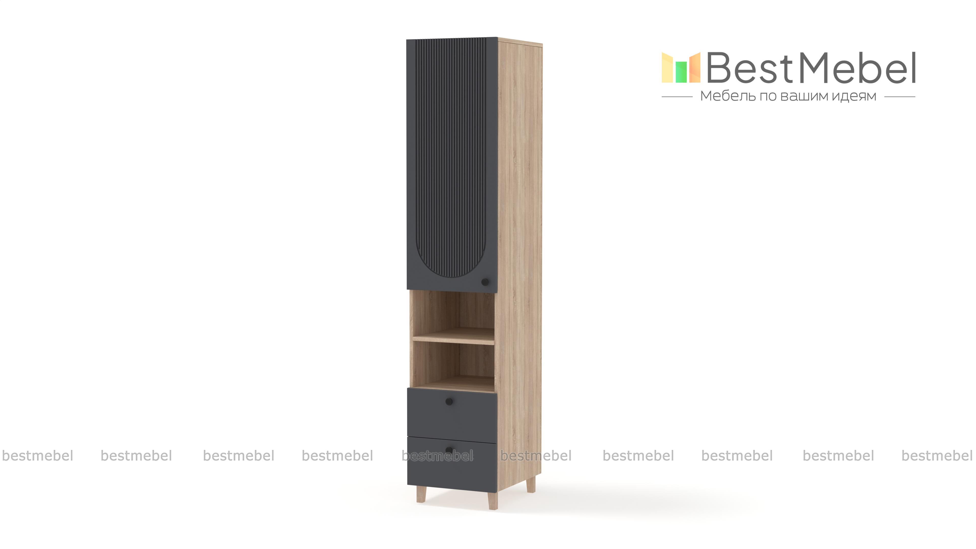 Шкаф-пенал Рене 4 BMS вместителен и легко вписывается в ограниченное пространство небольшой квартиры. На удобной высоте располагаются закрытое отделение, полки для необходимых в быстром доступе вещей и два выдвижных ящика. Установленный на высокие ножки, пенал облегчает уборку, а рифленый фасад из МДФ не только стильно выглядит, но и легко очищается от загрязнений. Купить шкаф-пенал Рене 4 BMS в оттенках нашего каталога и необходимом размере вы сможете на сайте интернет-магазина.