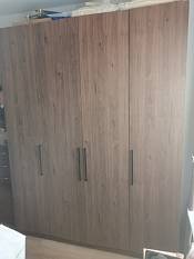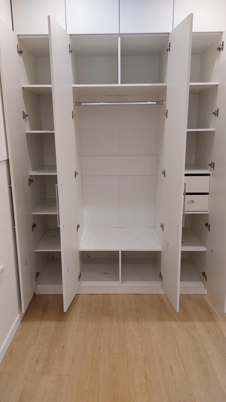 Шкаф распашной Остин Лайт 3 BMS (1860х2490х550), заказ 00000204766. Делали ремонт в коридоре и необходимо было заменить два шкафа, прихожую и дверцы на антресолях. Всё заказали здесь. Увидели на сайте этот шкаф и поняли - это то, что искали. Самостоятельно поменяли размеры, цвет фасадов (Тэффи L) и цвет самого шкафа (серый), кромку лицевых частей на 2 мм. ручки оставили эти (понравились), петли поменяли на Блюмовские с доводчиками. Внутри не меняли, был как надо. Середина - штанга и две полки (сверху и снизу), по бокам полки. Получился очень большой и вместительный шкаф. После оформления заказа на сайте, перезвонила менеджер (минут через 20), еще раз всё уточнила и перепроверила, помогла с точными размерами, чтобы шкаф точно встал в нишу. Всё изготовили быстро. Позвонили и согласовали день доставки. Доставка хорошая, оформляли с поднятием в квартиру. Комплектация полная, всё целое. Выдали документы с гарантией и телефоном компании по сборке. Позвонили туда и через час с нами связался сборщик, согласовали уже с ним дату и время. Отличный парень по сборке мебели. Собрал нам сразу два шкафа и прихожую за 4 часа. Спасибо, что появился такой интернет-магазин! Цена шкафа намного ниже, чем заказывать в компаниях по изготовлению мебели на заказ (узнавали в 5 компаниях) и сроки изготовления в несколько раз быстрее. Спасибо, что появился такой интернет-магазин!