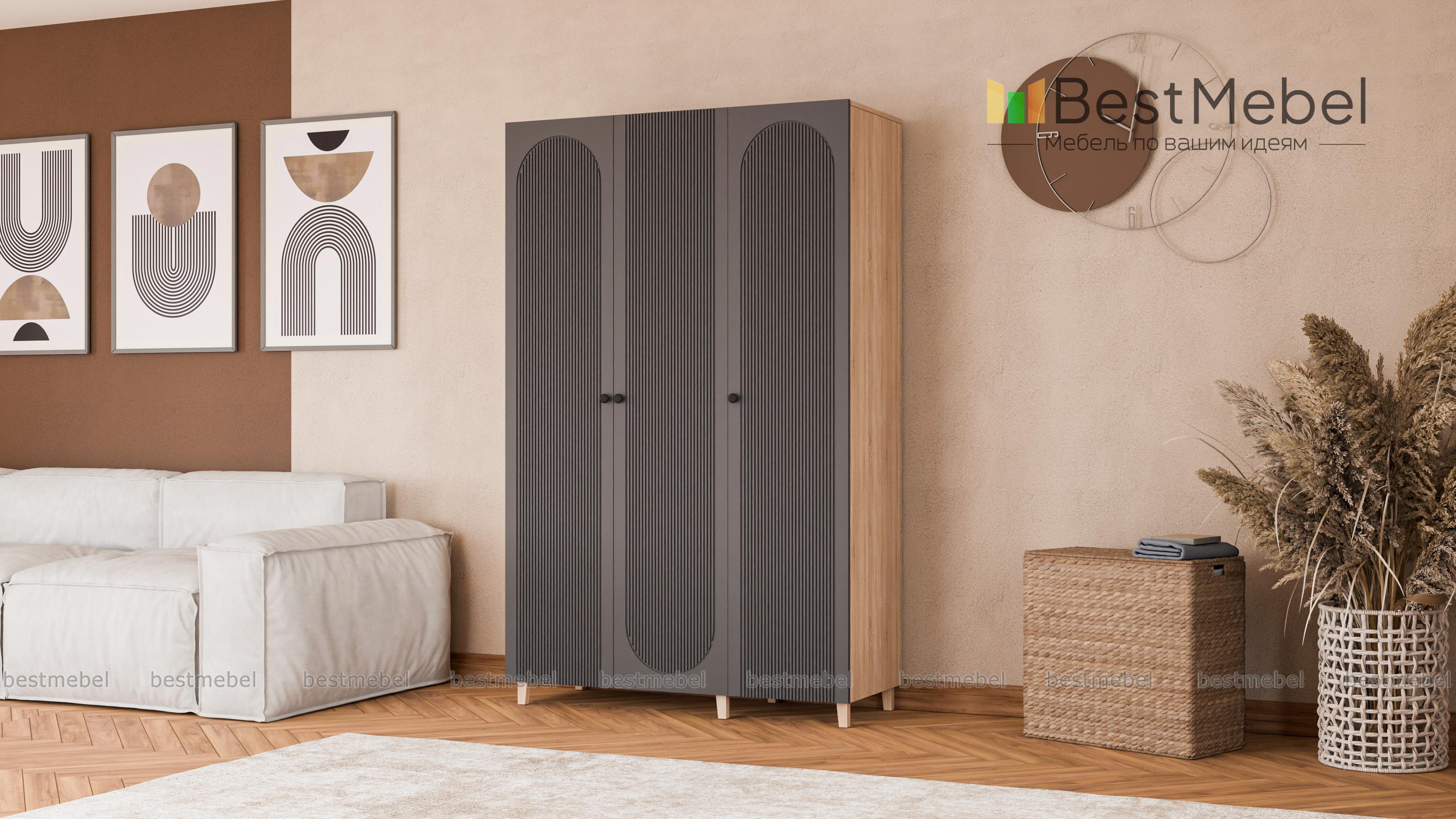 Шкаф распашной Рене 21 BMS в светлом оттенке станет универсальным выбором для разных по стилю интерьеров. Визуально легкая за счет высоких ножек конструкция имеет три распашные дверцы, за которыми скрыты платяная штанга и полки для одежды. Особенность дизайна этой современной модели — изящная фрезеровка фасада с полукруглыми вырезами. Купить шкаф распашной Рене 21 BMS вы сможете недорого в нашем интернет-магазине с индивидуальным подбором размеров, цвета и фурнитуры.