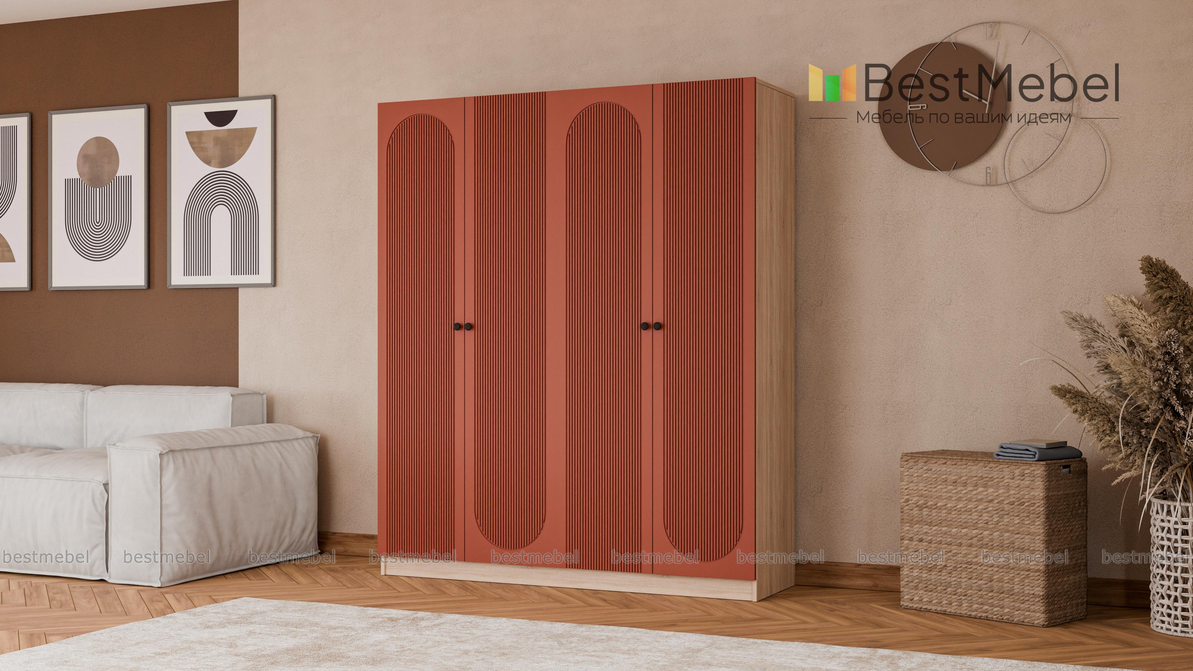 Шкаф распашной Рене 26 BMS сочетает в себе современную эстетику, функциональность и надежность конструкции. Два платяных отделения с дверцами оснащены всем необходимым для хранения одежды на вешалках и в сложенном виде. Геометрический рельеф на фасаде темного оттенка превращает этот вместительный четырехдверный гардероб в центральный элемент дизайна. Купить шкаф распашной Рене 26 BMS приглашаем в наш интернет-магазин с выбором размеров, цвета и фурнитуры.