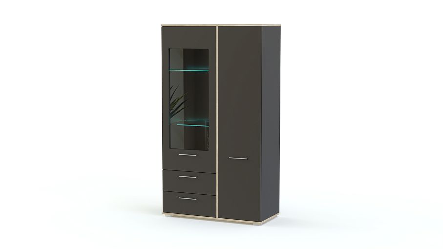 Витрина Энио BMS станет оригинальным акцентом в интерьере гостиной или столовой. Компактная модель в темных графитовых тонах с контрастной окантовкой будет уместна и в классическом, и в современном интерьере. Благодаря комбинированной конструкции витрина позволит разместить не только посуду и предметы декора, но и множество бытовых мелочей в выдвижных ящиках и распашном отделении. Купить Витрину Энио BMS недорого вы сможете в нашем интернет-магазине.