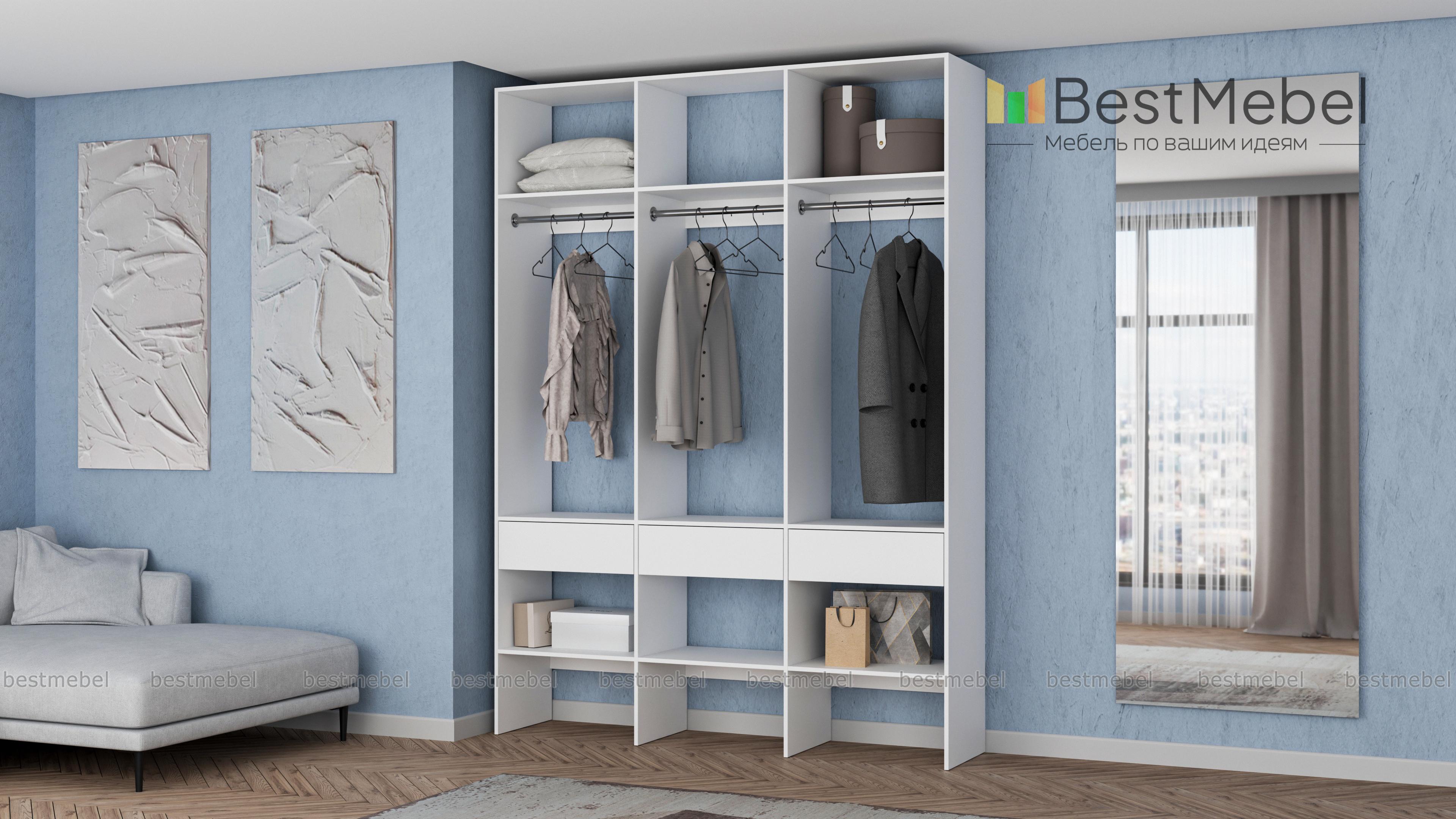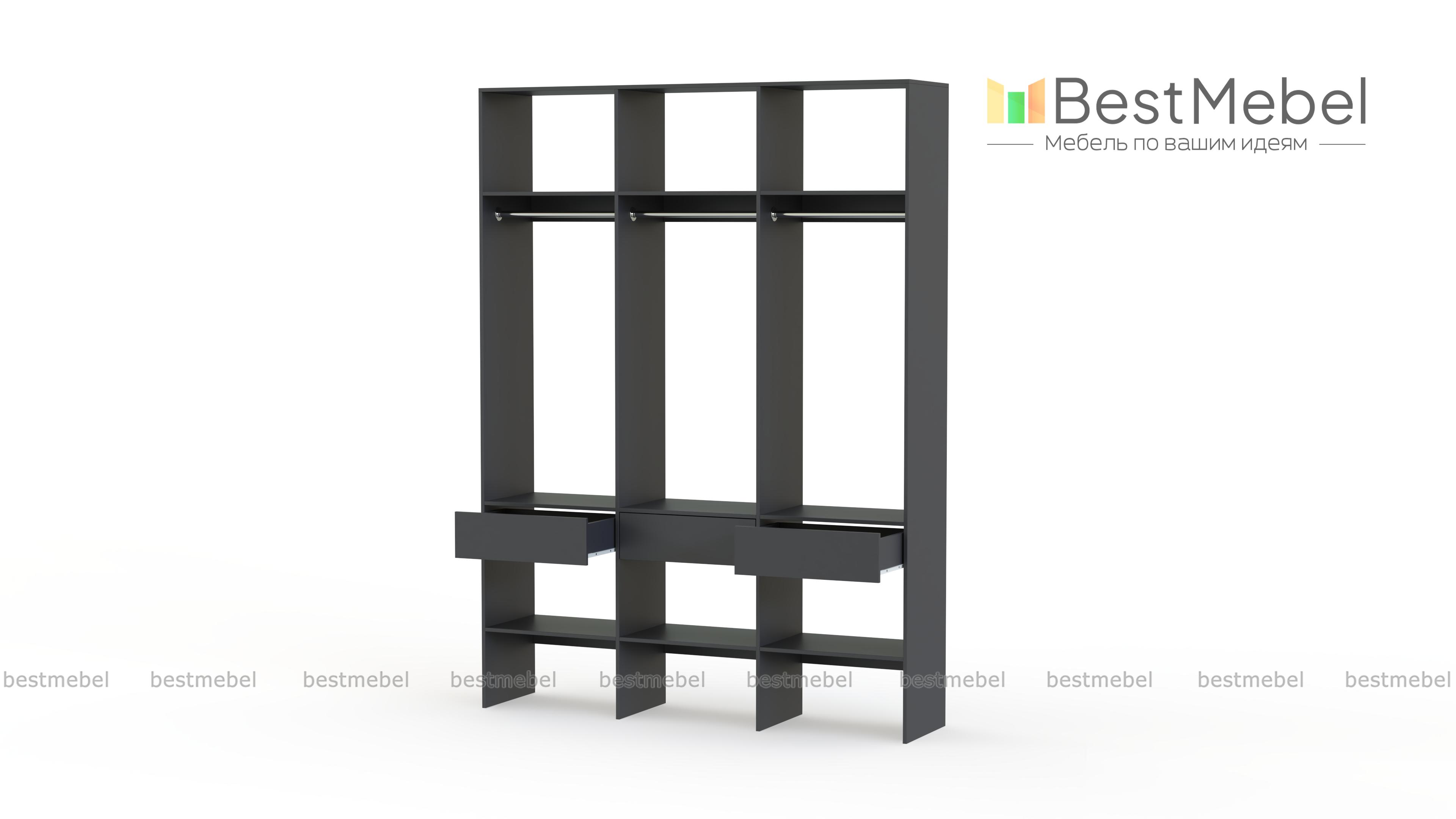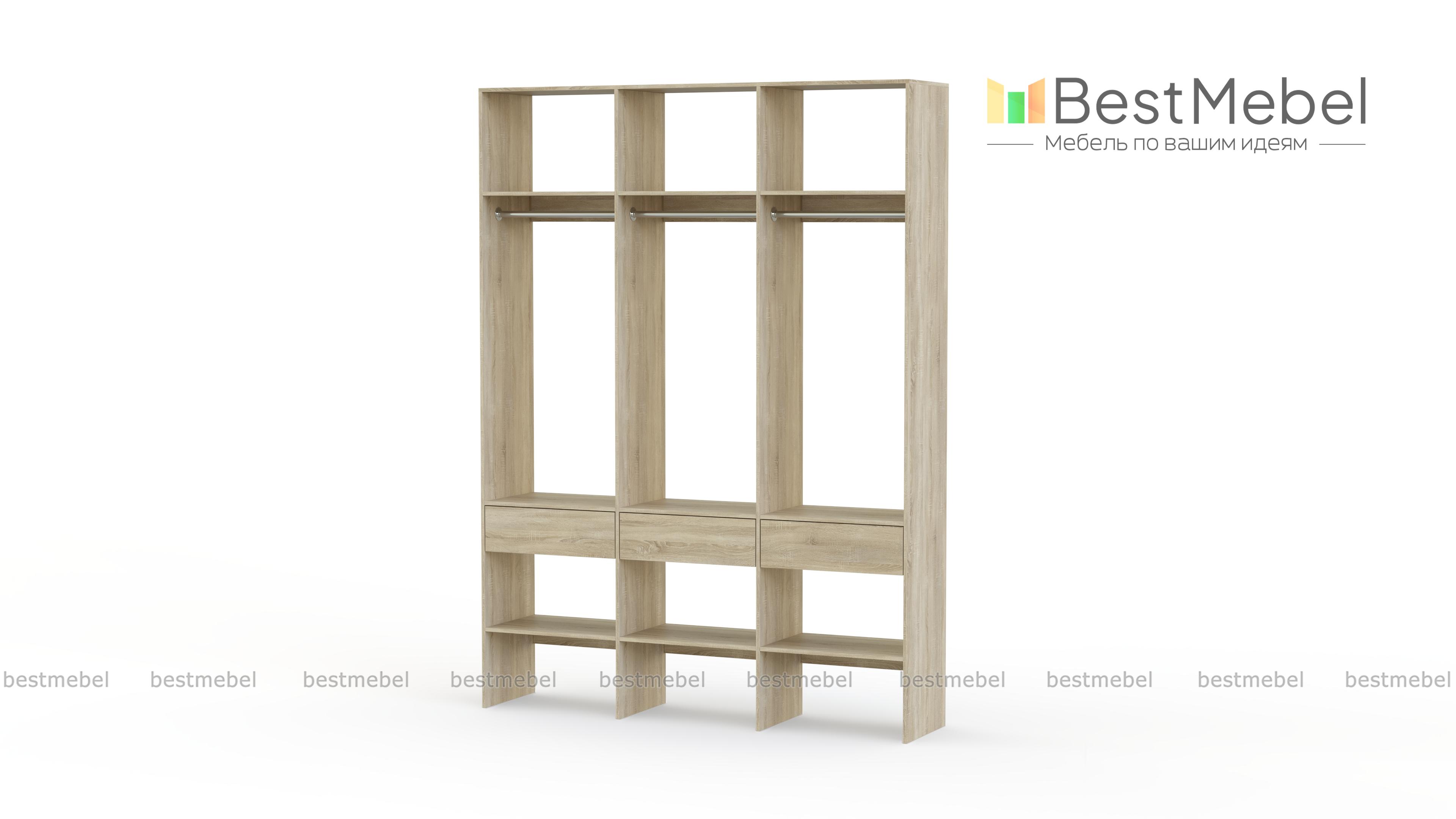 Стеллаж для одежды Мирта 51 BMS — визуально легкая и надежная конструкция из ламинированной ДСП, которую легко вписать в интерьер. Трехсекционный стеллаж прекрасно подходит для современных прихожих и гардеробных. Для вашего удобства три бельевых ящика и обувные полки располагаются снизу, а пространство над штангами занято полками для редко используемых вещей. Купить стеллаж для одежды Мирта 51 BMS вы сможете на сайте нашего интернет-магазина, подобрав цвет и размеры.