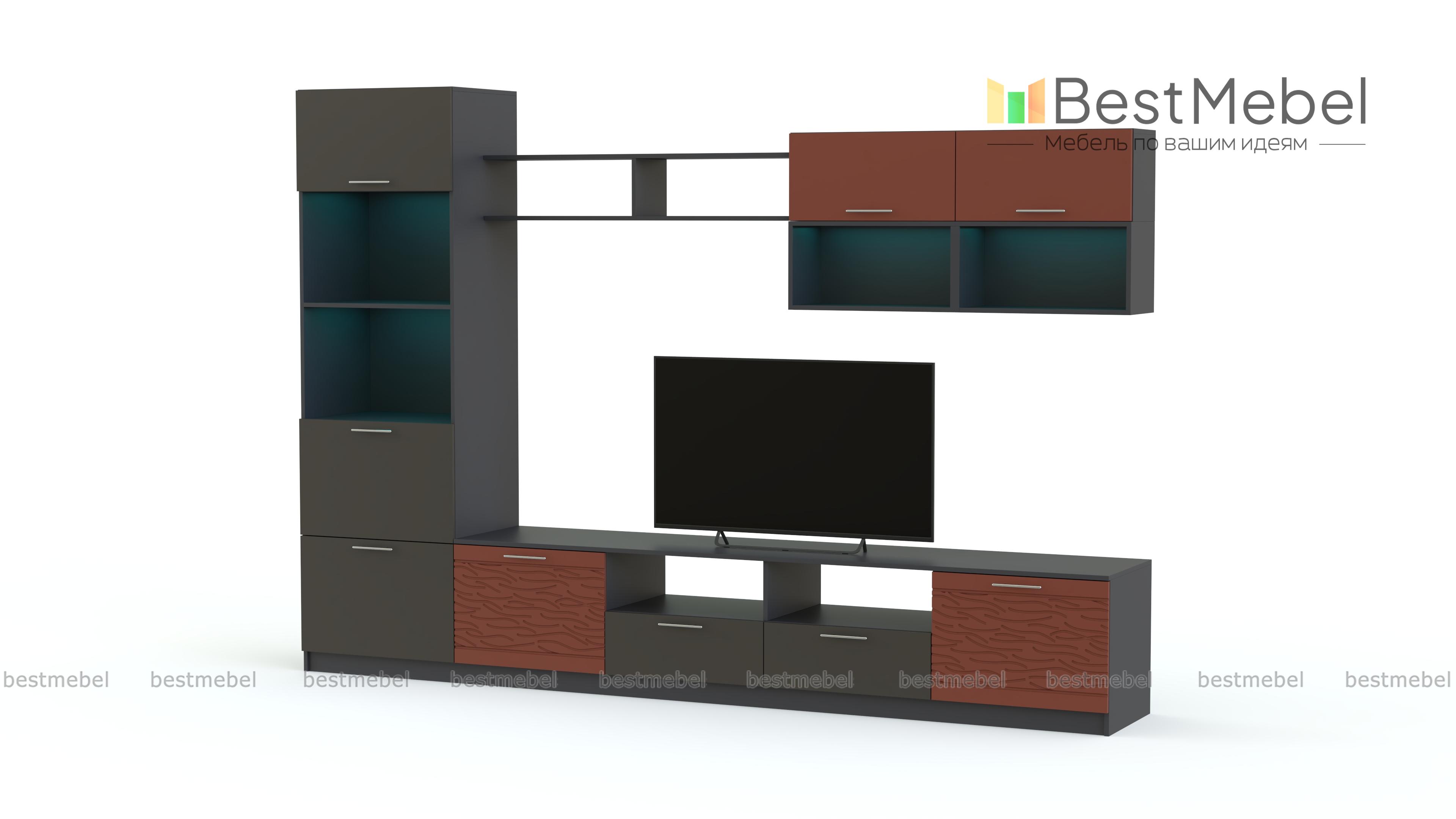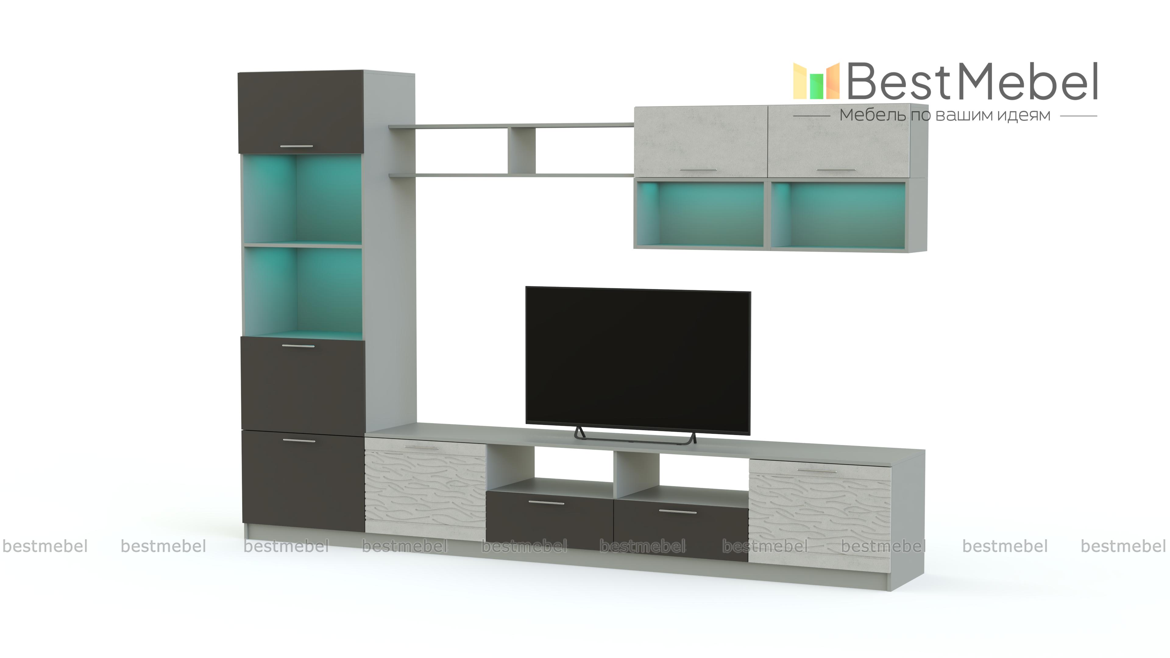 Стенка Вельвет 23 BMS поможет оформить зону ТВ, разместить книги, предметы декора и разнообразные домашние мелочи. Лаконичный модульный комплект станет прекрасным выбором для современных гостиных в стиле минимализм. Среди элементов низкая широкая тумба с распашными дверцами, ящиками и нишами, напольный комбинированный шкаф, открытые полки и навесной модуль. Сочетание матовых поверхностей с 3D рисунком и подсветки придает стенке особенно эффектный вид. Купить стенку Вельвет 23 BMS, подобрав необходимые параметры, вы сможете в нашем интернет-магазине.