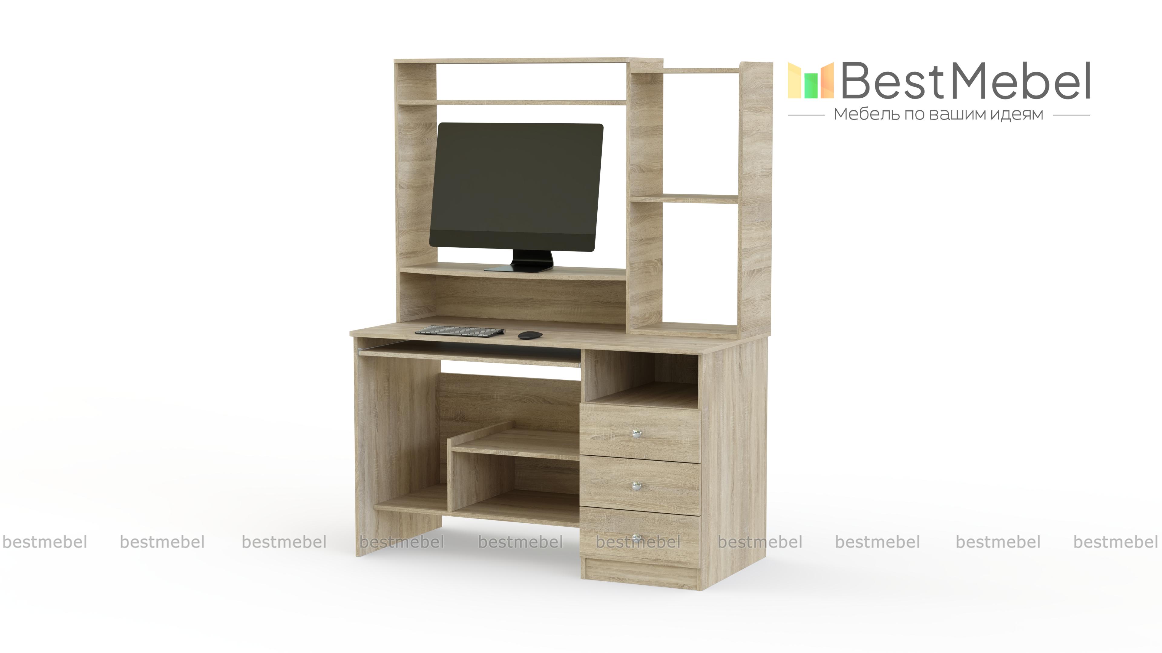 Добротный стол, с множеством функциональных мест, предназначен для комфортной работы за компьютером. Стол имеет специально отведенное место для компьютерного блока, монитора. Для клавиатуры имеется выдвигающаяся полка, в наличии вместительная тумбочка с 3 выдвижными и 1 открытым ящиком. В верхней части стола множество открытых полок для размещения всего необходимого и элементов декора. Купить стол Рома можно для детской комнаты, он будет исполнять роль письменного стола. Базовые размеры могут быть увеличены.