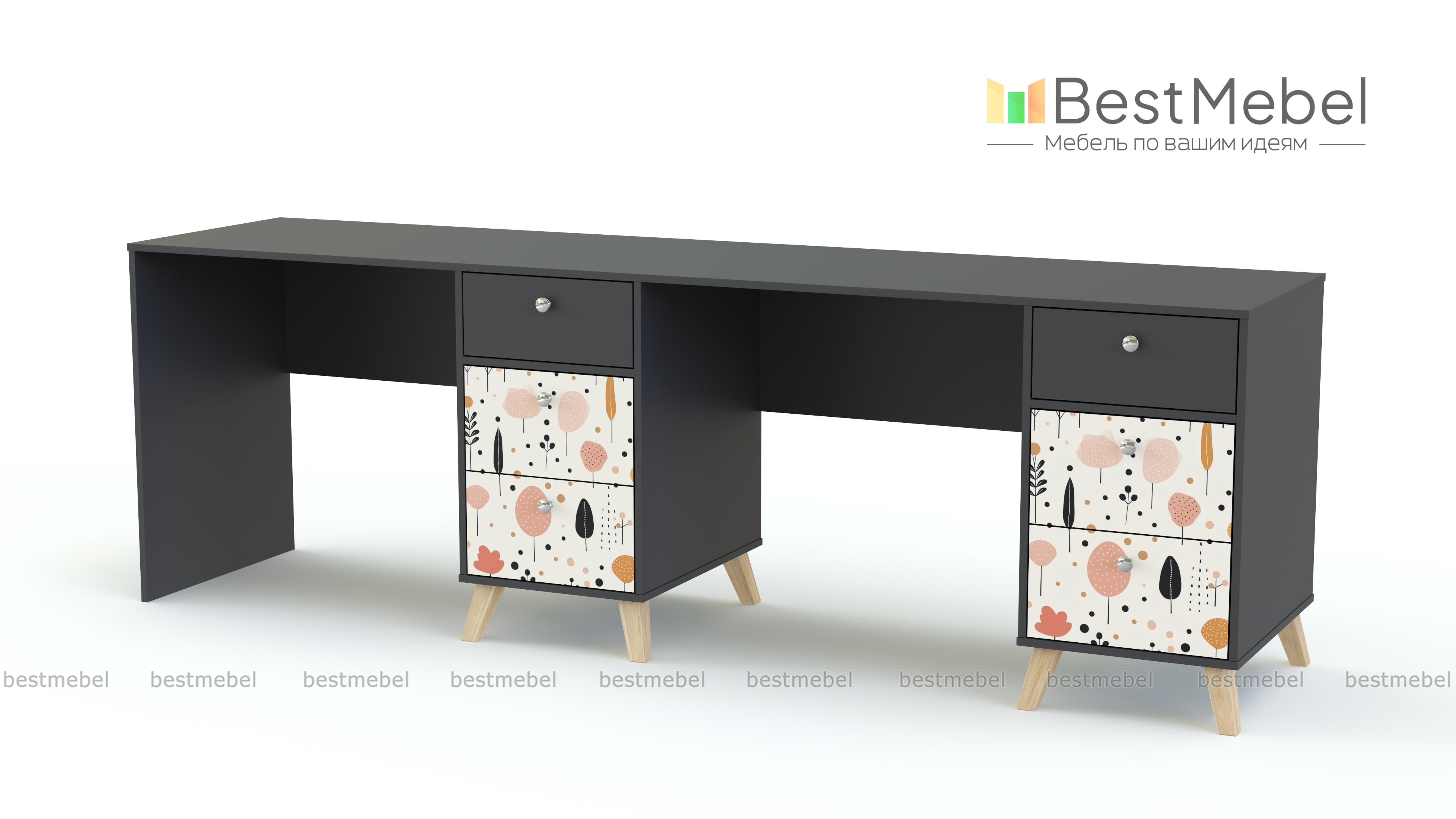 Письменный стол для двоих Эльза 3 BMS обеспечит экономию пространства и комфортное рабочее место каждому ребенку. Удлиненную столешницу разделяют тумбы для хранения канцелярских мелочей и учебников, оснащенные тремя выдвижными ящиками с удобными круглыми ручками. Благодаря сканди-ножкам, теплой нейтральной гамме и стильному принту дизайн стола актуальный и при этом вполне универсальный. Купить письменный стол для двоих Эльза 3 BMS, изготовленный по индивидуальным размерам, вы сможете в нашем интернет-магазине.