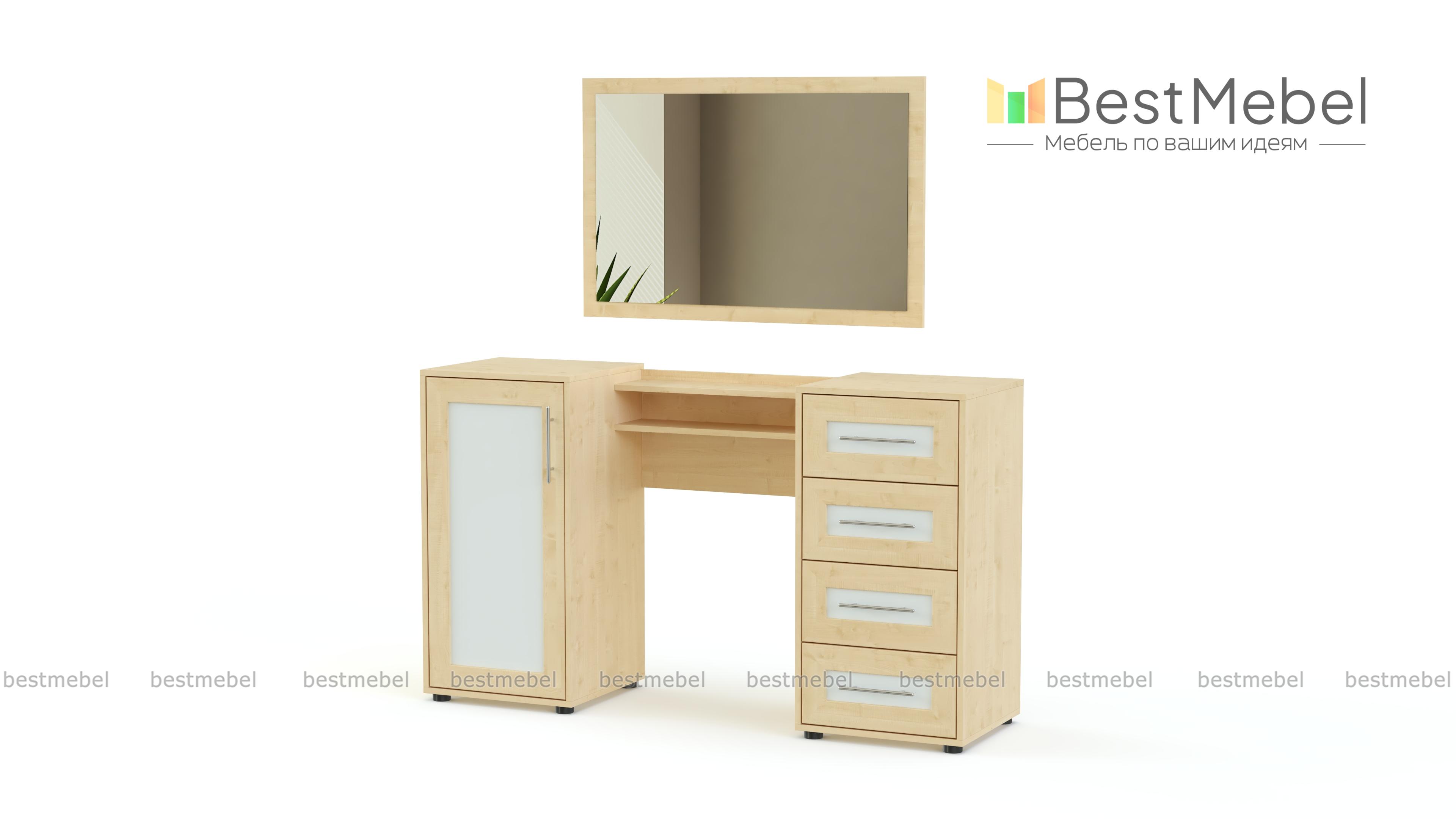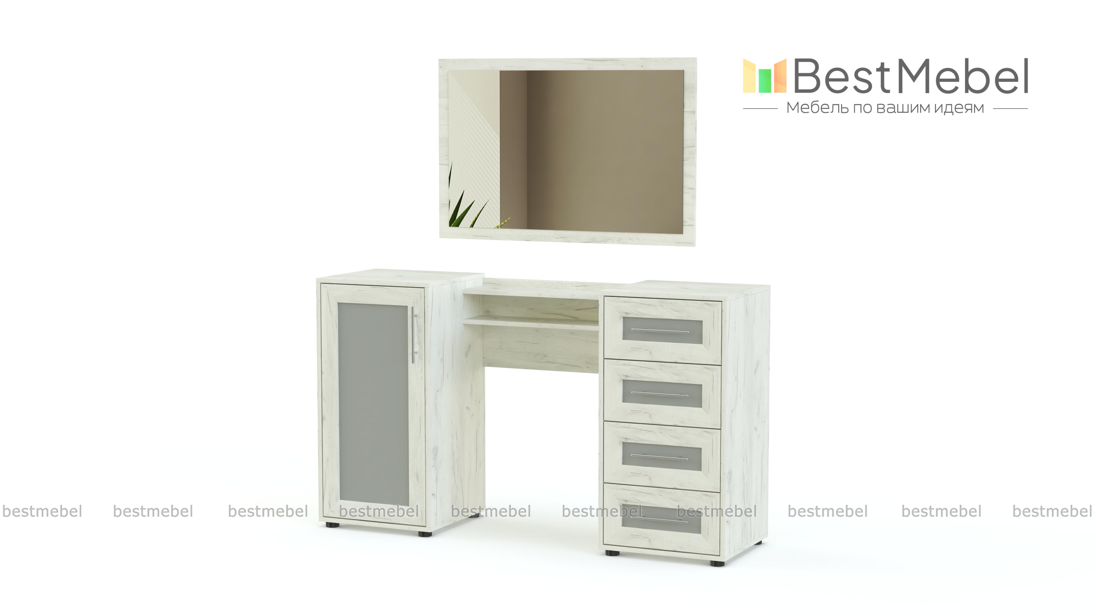Классический комплект из туалетного столика и навесного зеркала. Этот традиционный вариант удобен возможностью самостоятельной регулировки высоты и ориентации зеркала. Отличает его и отменная вместительность, косметика, украшения и многое другое без труда разместится в выдвижных ящиках и на полках двух боковых тумб, углы которых безопасно скруглены. Дизайн туалетного столика Токио BMS порадует любительниц классики, спокойных благородных расцветок и декорированных фасадов.