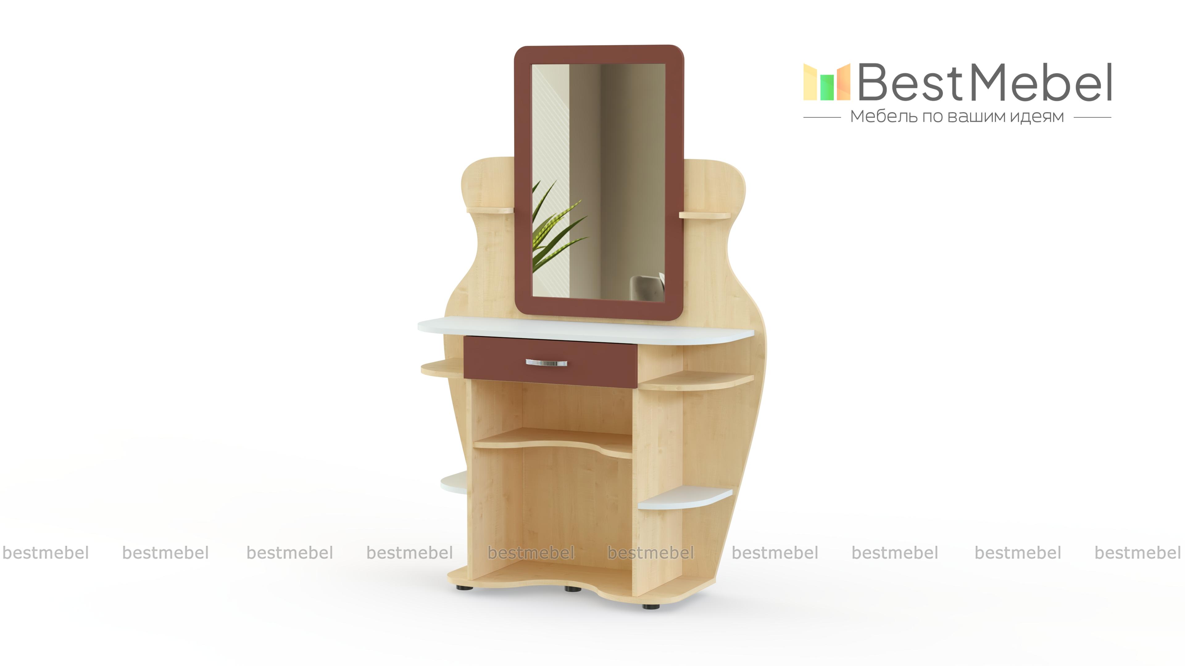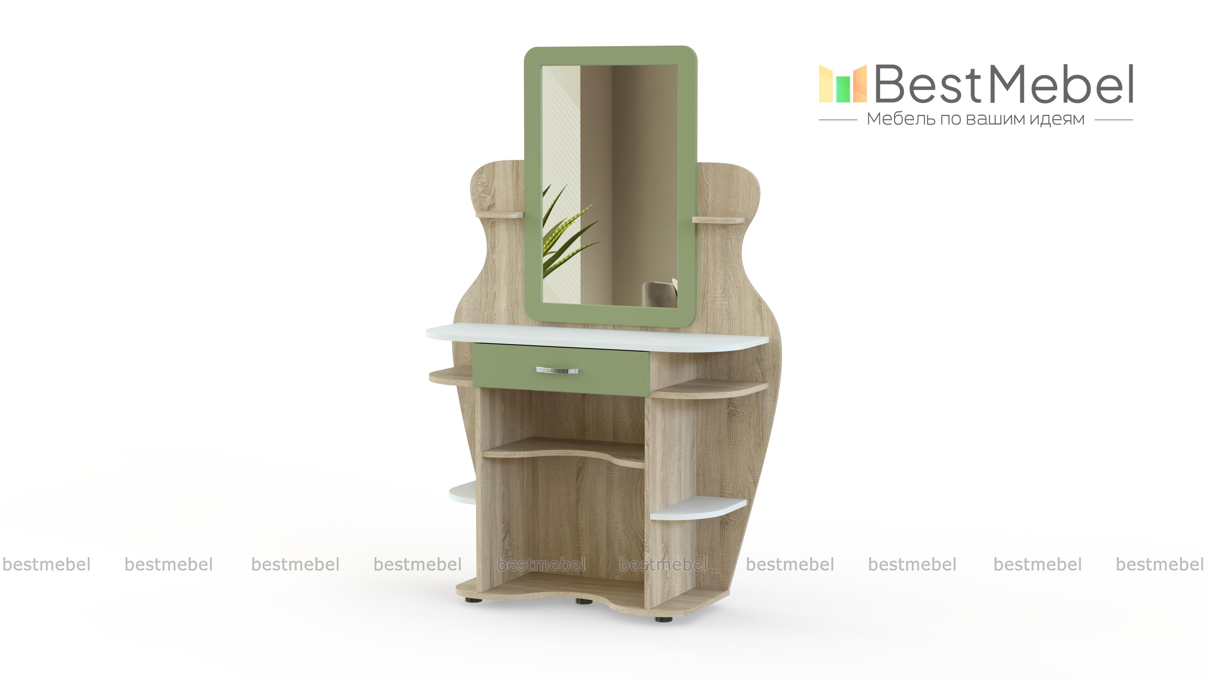 Туалетный столик Яся BMS, изготовленный из безопасной ламинированной плиты в оттенке светлого дерева, предназначен специально для детской. Скругленные полочки и волнообразно вырезанный декор позволяют не бояться острых углов и создают изящный силуэт. Столик оборудован большим зеркалом и ящиком для мелочей, а по бокам и под столешницей располагаются открытые полочки под косметику, аксессуары, декоративные мелочи. Купить туалетный столик Яся BMS вы сможете в нашем интернет-магазине, подобрав цветовую гамму.