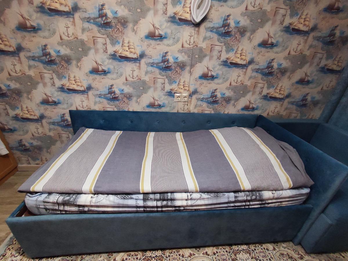 Купили сыну кровать "София", она гармонично вписалась в интерьер. Сделана качественно, ткань подобран под цвет комнаты (в магазине большой ассортимент ткани). Очень большой ящик для белья с подъемным механизмом. Доставили почти собранную, осталось только стенки приделать.К покупке рекомендую.Заказ 00000610621