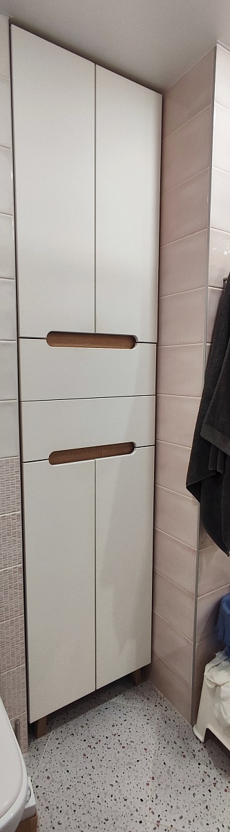 Заказ 836381. Шкаф полностью соответствует моим ожиданиям. Быстро помогли сделать по моим размерам. Согласовали эскиз. Доставка через 3 дня. Собирал супруг. Сложностей не возникло. Шкаф в ванной. За 2 года ничего с ним не произошло. Всё в полном порядке.