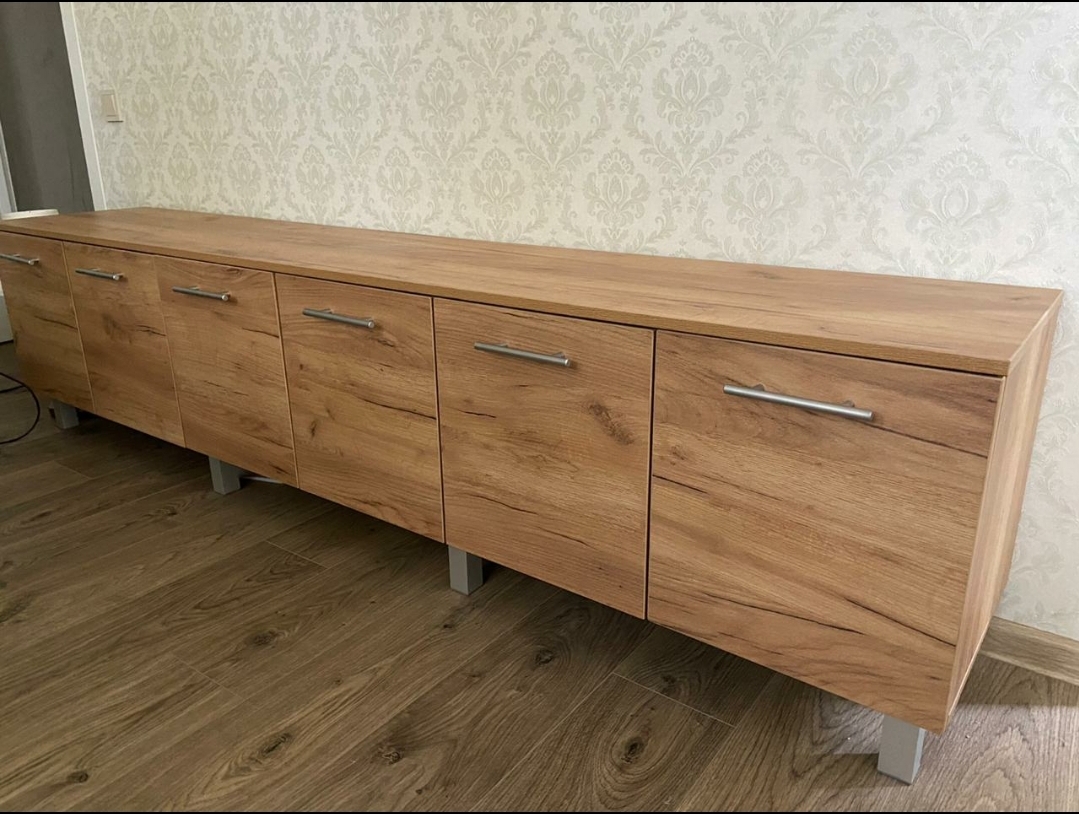 Отличная тумба, приятный современный вид,  цвет выбрали золотой крафт, смотрится прекрасно, отдельно докупались ножки хром в цвет ручек, чтобы влажную уборку делать, но можно было и подвесить. На тумбу кладу ноутбук, сумки гостей, фрукты/десерты, много чего, внутрь вмещается много контейнеров с всякой всячиной: книги, нитки, лекарства и пр. Я на неё сажусь иногда, выдерживает (по этой причине не хотели подвешивать).  Размер тумбы на фото: 220 × 44× 40 см. Рекомендую!