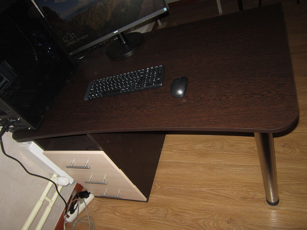 Стол просто отличный. Очень крепкий. Соединительных болтов не жалели.  Полка для клавиатуры удобная.  Очень вместительный. Цвет белое дерево, ламинирование качественное.  Пользуюсь 2,5 месяца. Все нравится. Рекомендую.