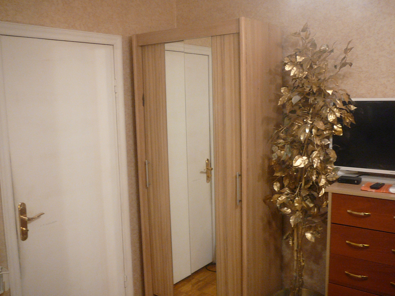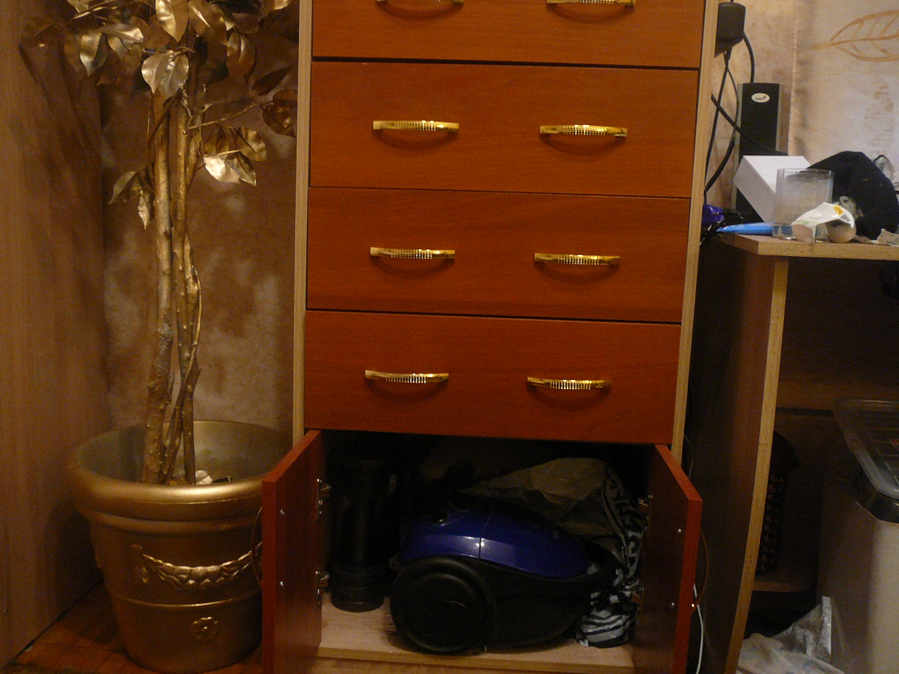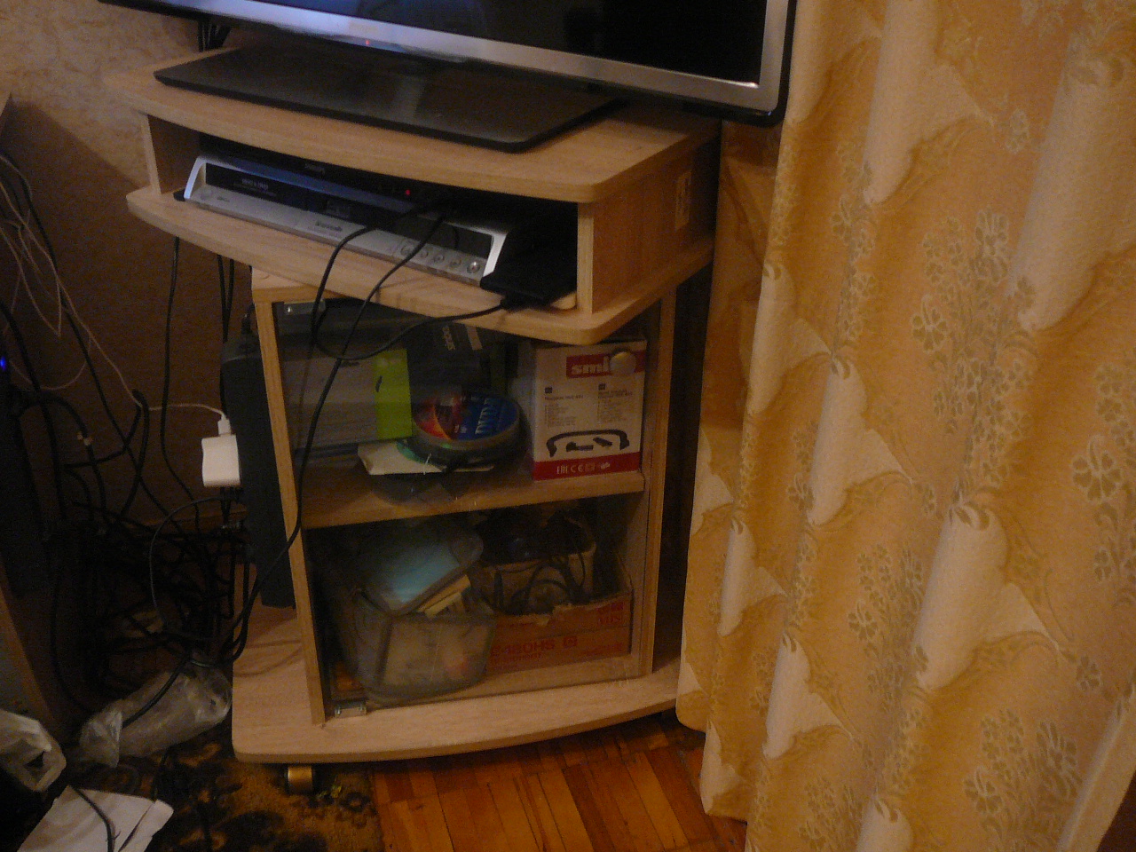 Заказ 201621 Темный цвет сразу же было решено заменить на светлый ,как советуют дизайнеры,в малых комнатах особенно ,также увеличена высота для удобства просмотра телевизора. Сама тумба ,как видно на снимке ,смещает также много : маленький пылесосик, аптечку , диски ДВД и еще много вещей ))))